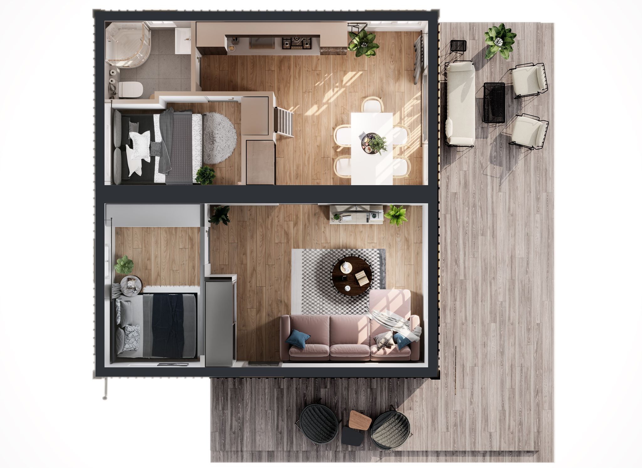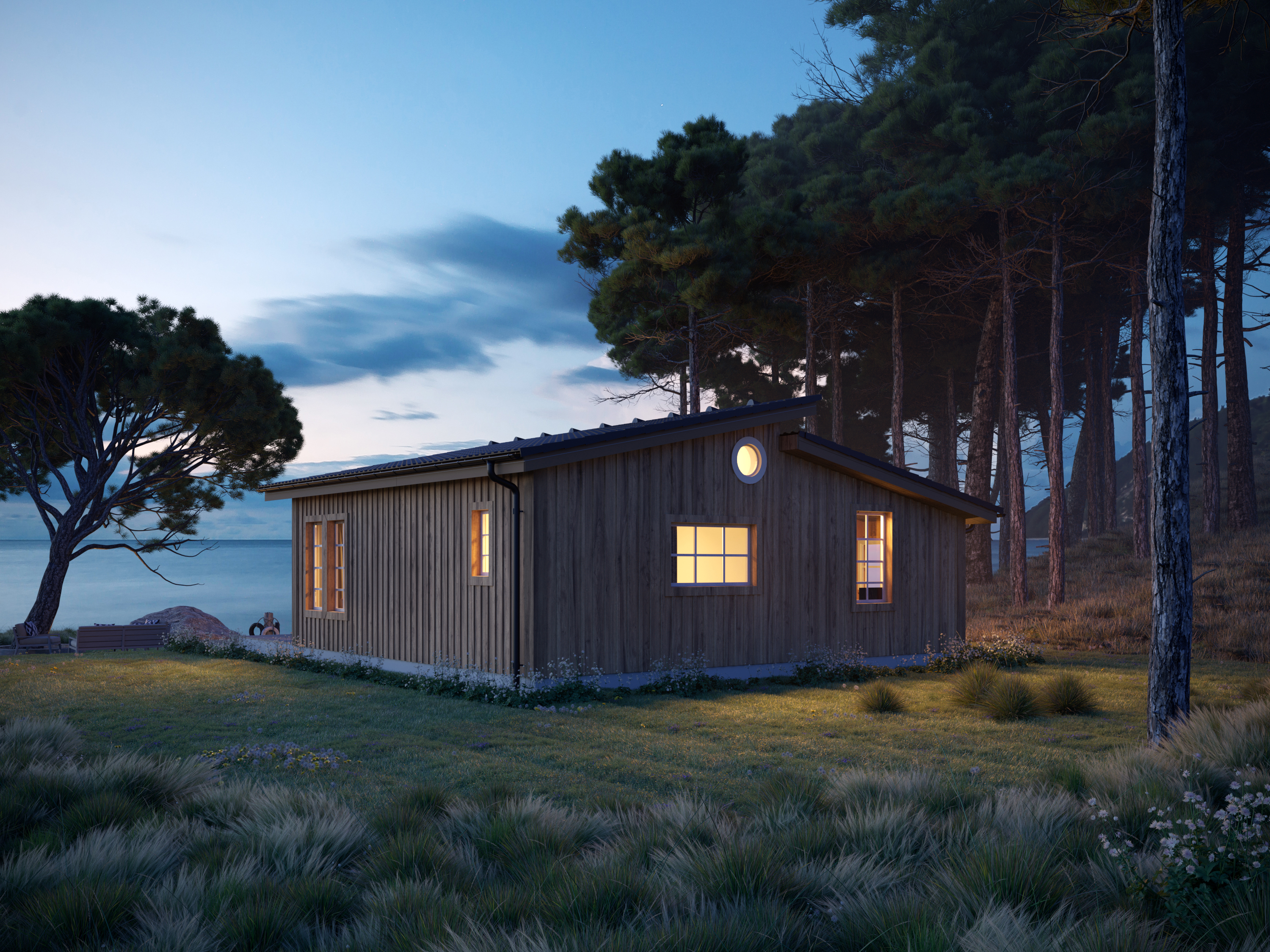 Framtid 60 kvm, ett fritidshus i en precis lagom storlek. I denna storlek är det inritat två sovrum med sovloft. Vilket ger plats för både barn och gäster. Du hittar ett härligt fönsterparti ut från köket, och rymlig yta för att umgås med familj och vänner. Det finns två varianter på planlösning att välja mellan till detta hus. Våra hus är byggda med kvalitets trä och vi arbetar långsiktigt med hållbarhet.